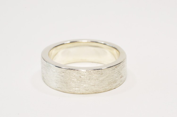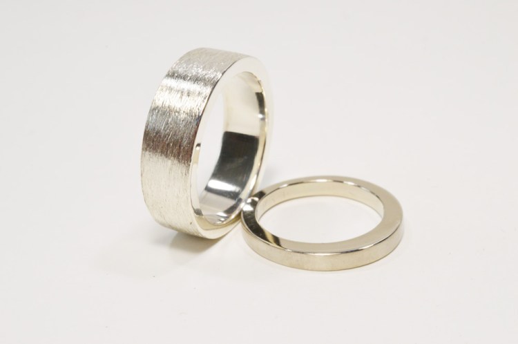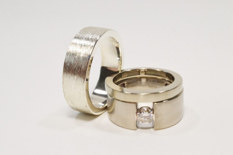 Alex and Scott 14k White Gold, Sterling Silver. Wedding rings for Alex and Scott. The engagement ring was store bought. The couple were closely involved in the design process to create the matching set.