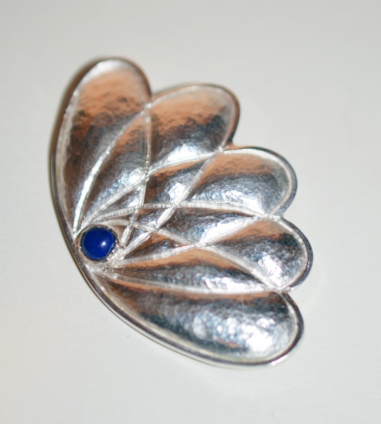 Five Petal Brooch Sterling silver and lapis lazuli. Chased brooch. Designed using spirograph toy and selective removal. $180