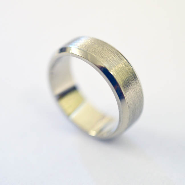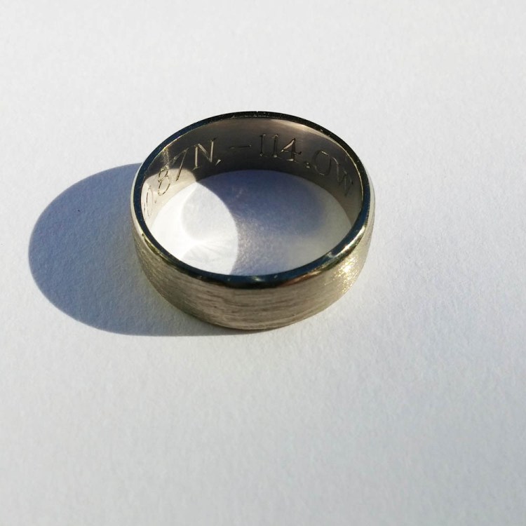 James 18k white gold. James’s wedding ring. Engraved with the GPS coordinates of the location of the wedding.