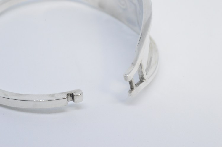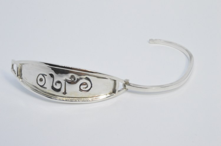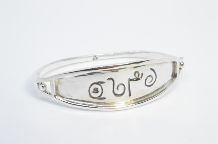 Pictish Bracelet Sterling silver Hinged bracelet with tension clasp. Chased Pictish symbols were aded representing the client’s name