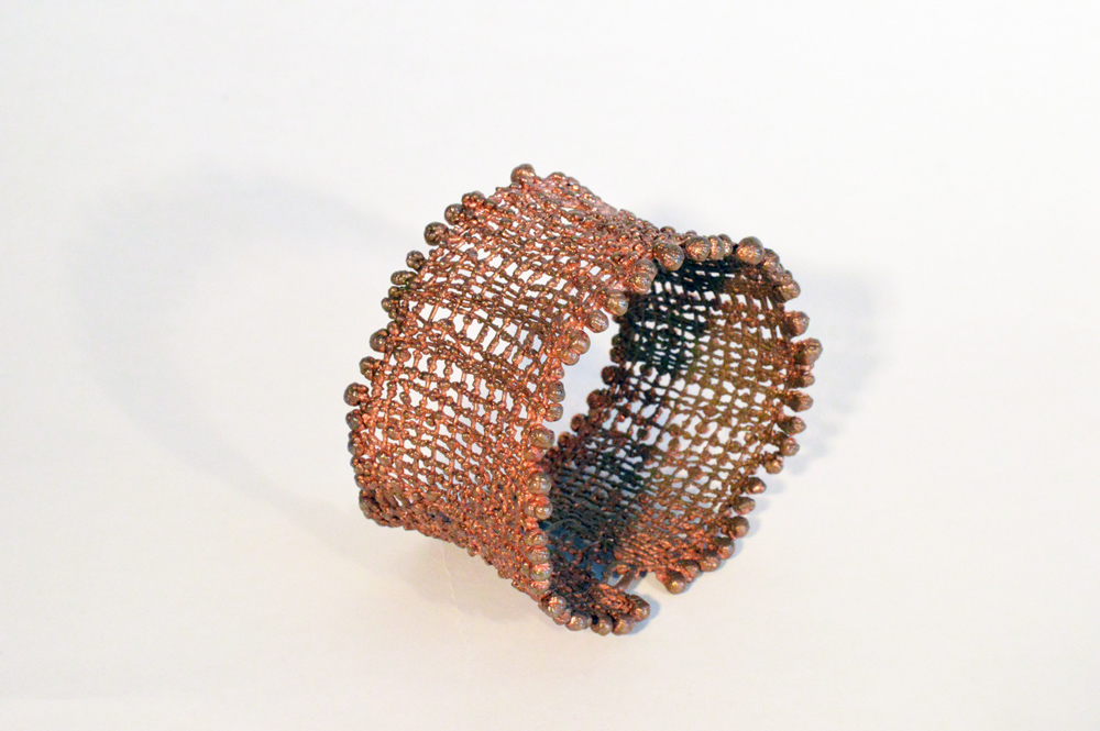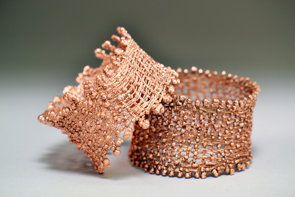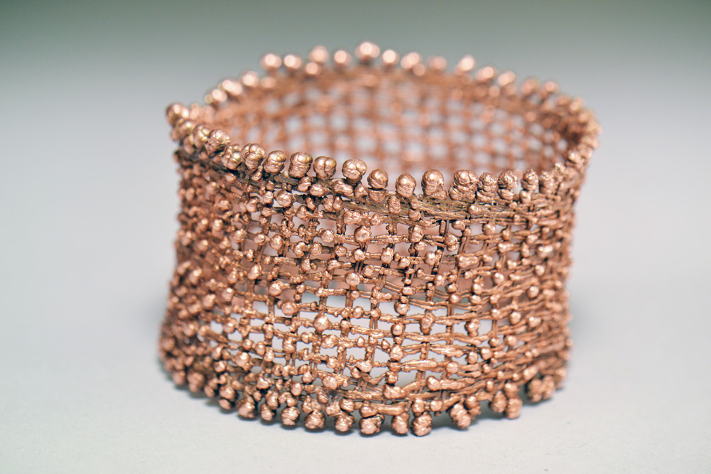 Created by weaving thin copper wire on a loom then immersing in an electroforming bath to add strength, material and texture.
