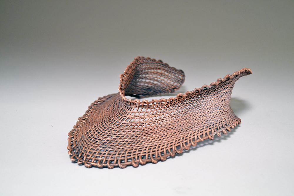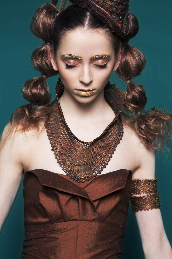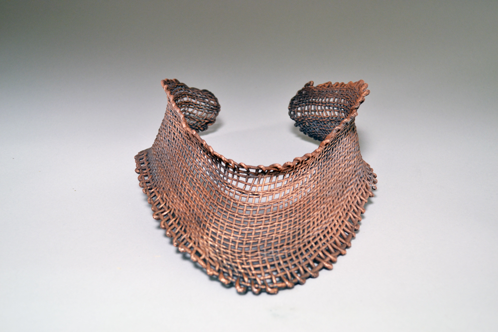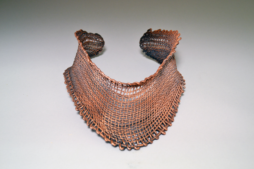 Woven Collar Copper wire. Created by weaving thin copper wire on a loom then immersing in an electroforming bath to add strength, material and texture. $1200 Photography: Elle Yi Fan Xu Model: Zoe Warren Garment: Shelby Shannon